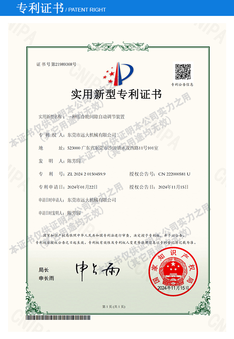 近日,東莞市遠大機械有限公司傳來喜訊,其自主研發的“一種壓合輪間隙自動調節裝置”成功獲得實用新型專利。 這一壓合輪間隙自動調節裝置具有諸多創新性和實用性。在傳統的機械運作中,壓合輪間隙的調節...